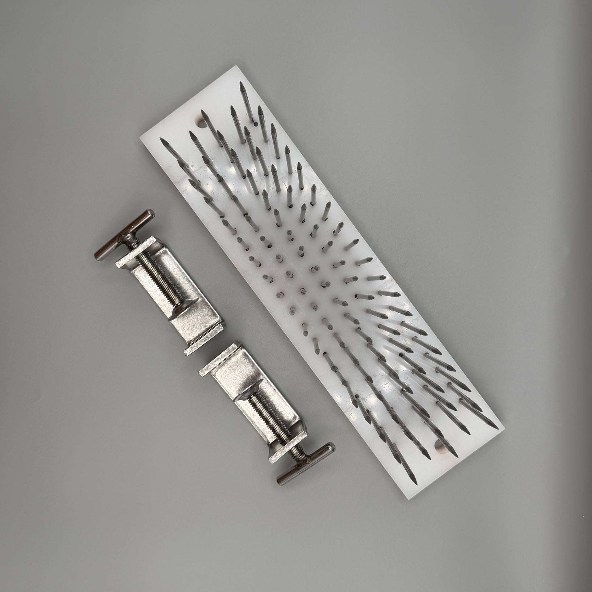 Carding comb with tall pins + 2 clamps for securing the carding comb.